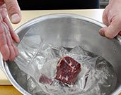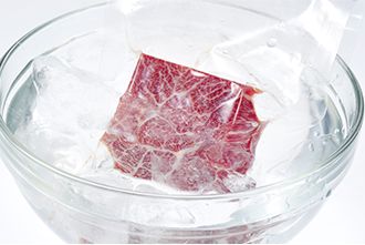 氷水の入ったボールなどに、未開封のままおよそ10分ほど浸けて下さい。肉の表面が柔らかくなるのが取り出しの目安です。