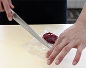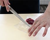 半解凍になった馬肉をボールから取り出し、真空パックを開封します。