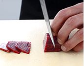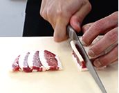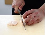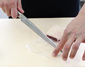 繊維目の方向に注意しながら、概ね2〜3mmくらいの厚さでスライスしてください。このくらいが食べやすい厚さとなります。