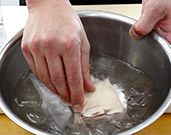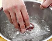 急激な温度変化で馬刺しを解凍してしまいますと、肉がダレてしまったり、色味が悪くなってしまいます。ボールに氷水を張り、じっくり解凍させます。 氷をたっぷり使うのがポイントです。