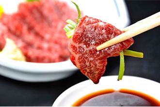当店の馬刺しは、トローッととろけるような食感に、旨みがギューっと凝縮した、強い甘みが特長です。このおいしさを最大限引き立てるの九州ならではの甘めの醤油。これにすりおろした生姜とにんにくのダブル薬味を添えて食べるのが最もおいしい熊本流馬刺しの食べ方です。